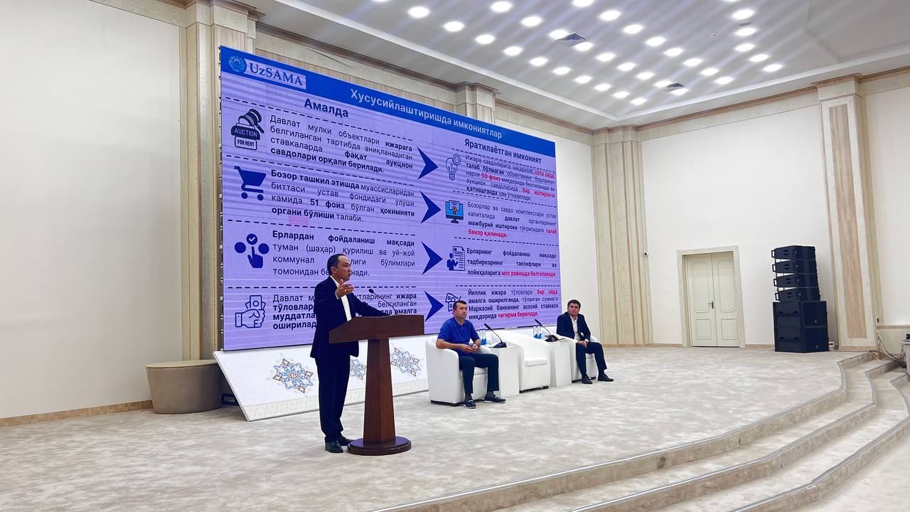 In turn, in order to explain the essence and content of this Decree to entrepreneurs and the general public in the localities, as well as to intensify its information and propaganda accompaniment, the State Assets Management Agency held another presentation ‘Roadshow’ in Navoi region on 17 May this year. During the event, state assets subject to privatisation were presented, including state shares in enterprises, empty state property, as well as land plots for sale.