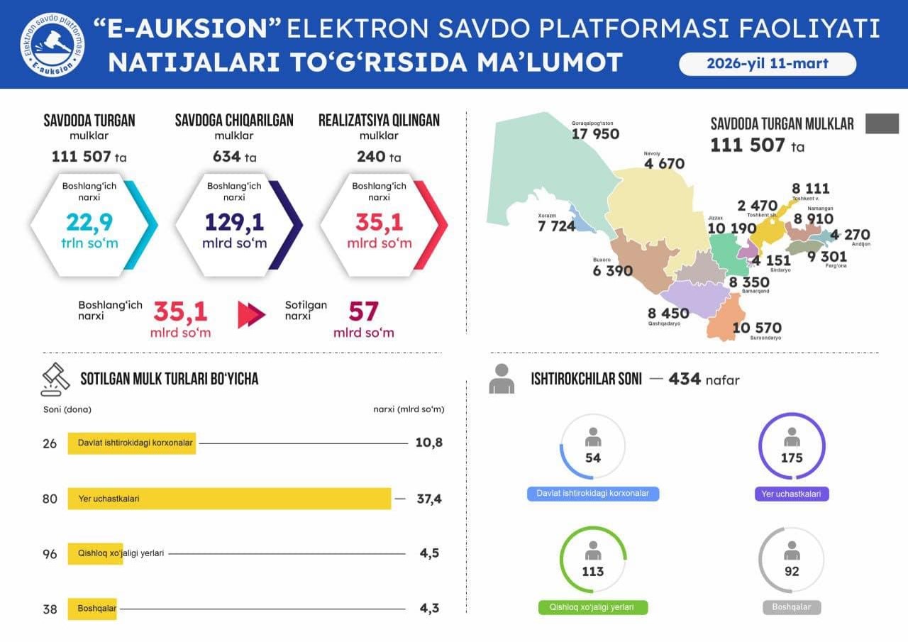 Ҳозирда, нархи 22,9 трлн сўм бўлган 111 507 та лот савдога қўйилган.