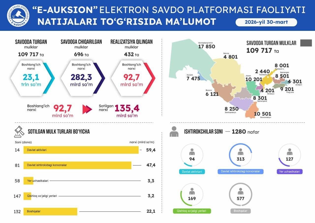 696 та лот онлайн аукцион савдоларига чиқарилди. Шунингдек, бошланғич нархи 92,7 млрд сўм бўлган 432 та лот 135,4 млрд сўмга реализация қилинди.